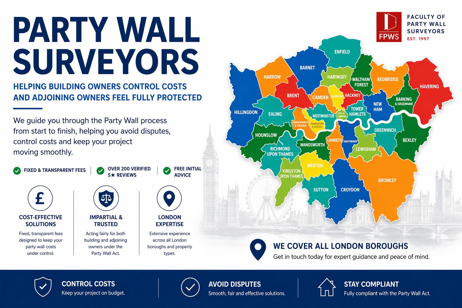 Preparation and negotiation of Party Wall AwardsAll our Party Wall Surveyors are specialists and work in accordance with the regulations set down by the Faculty of Party Wall Surveyors.